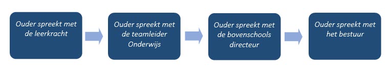 In de onderstaande stroomdiagrammen kunt u zien via welke route u met uw vragen terecht kunt bij verschillende personen. Als er vragen zijn over het algemeen beleid, dan kunt u rechtstreeks bij de teamleider of de bovenschools directeur terecht. De basisregel is dat u in het geval u iets bespreekbaar wilt maken m.b.t. het klassenbeleid of de leerlingzorg van uw kind u dit aangeeft bij de desbetreffende leerkracht. Daarna zijn de volgende escalatieladders van toepassing:
